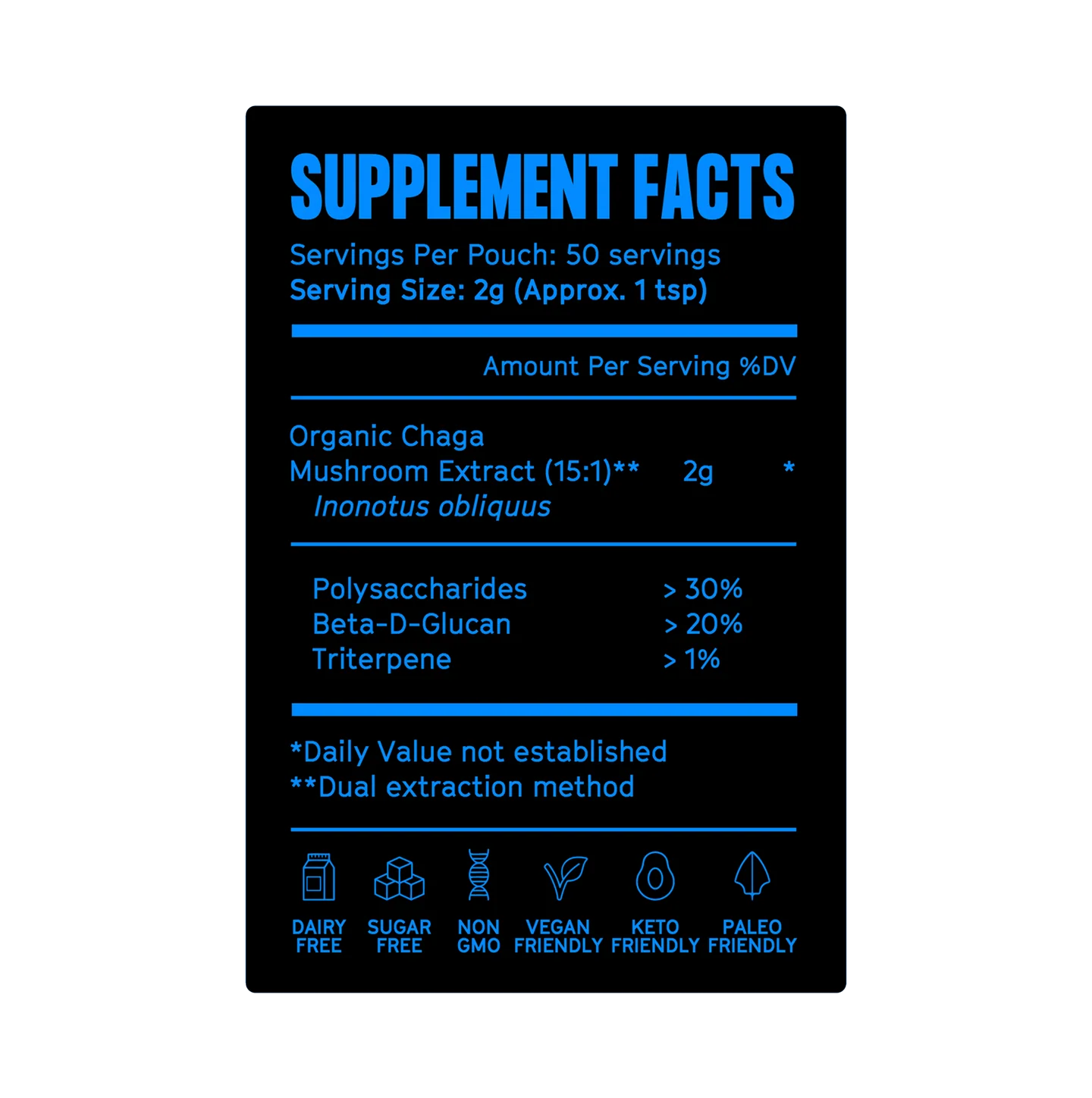 A single teaspoon of Chaga is said to have the same amount of antioxidants as a whopping 600 blueberries.